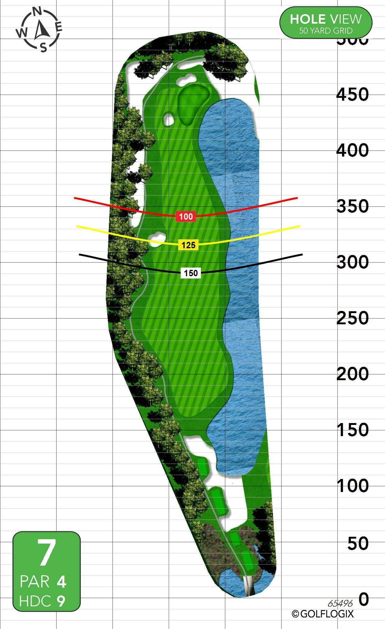 Hole number seven is a very intimidating par 4 off the tee with pines and a large bunker guarding the left and water the length of the hole on the right which can leave a small landing area with a driver for longer hitters. With a bunker left and short of the green, water right, and palm trees beyond, two good shots are required to keep out of trouble on this hole.